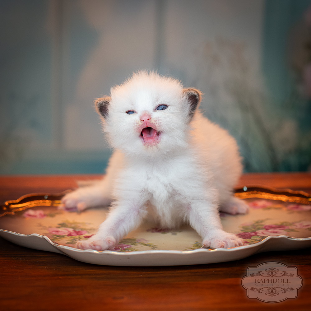 This girl is developing into a strong and well-balanced kitten, with a solid body structure and excellent overall type. Her beautiful, symmetrical geometric facial markings already highlight the elegance and harmony expected from top-quality Ragdolls.